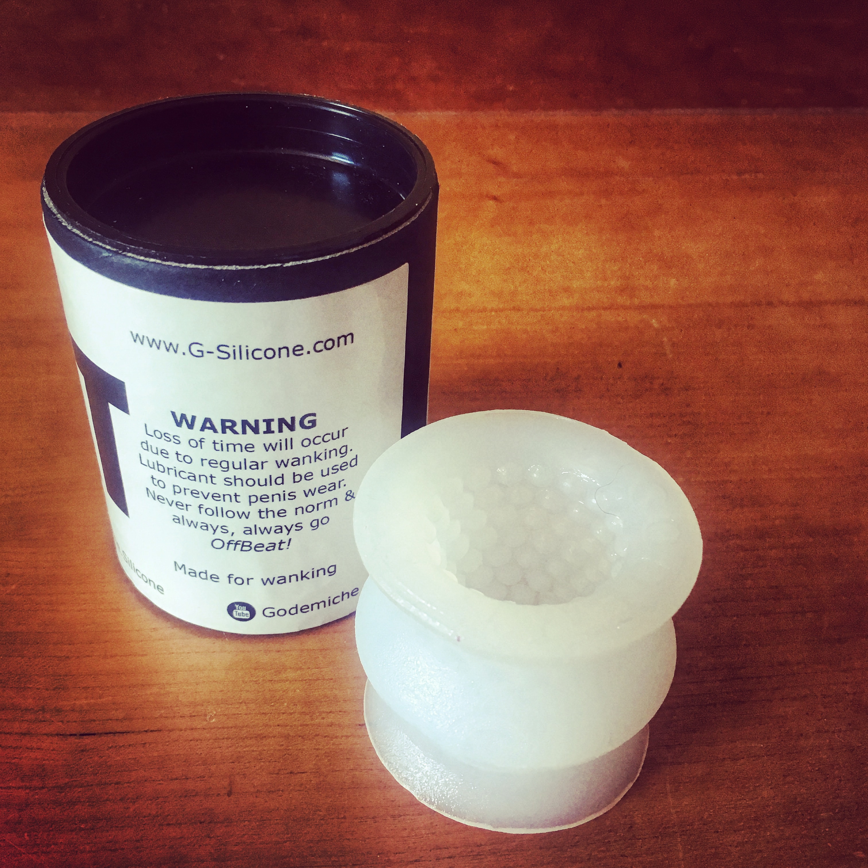 When I settled down to serious reviewing and opened the OffBeat, I was charmed by its squishy silicone and fun inner texture. I also laughed at the warning on it’s tub – and quickly proved that it was very, very true. The Adam is a quite a thick dildo – just over 4cm in diameter – and it took a generous helping of lube to pull the OffBeat over it’s head.